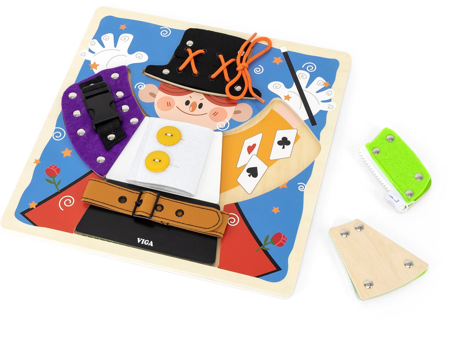 Aktivitetstavle fra VIGA i træ med mange sjove, lærerige funktioner. Hjælp den lille tryllekunstner med at klæde sig på og træn dine påklædningsevner med knapper, lynlås, spænde, blonder og bælte. Hver kundskab er fastgjort på en separat, aftagelig træpuslespilsbrik, der er let at øve sig med. Fjern brikkerne og find små overraskelser der er gemt nedenunder. Perfekt til træning af dit barns finmotorik. CE-mærket. Anbefalet alder: Fra 1,5 år. Træ.