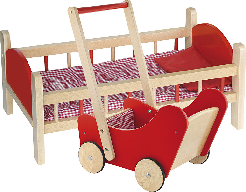Viga - Dukkevogn Og Dukkeseng I Træ - Rød - 2 Dele