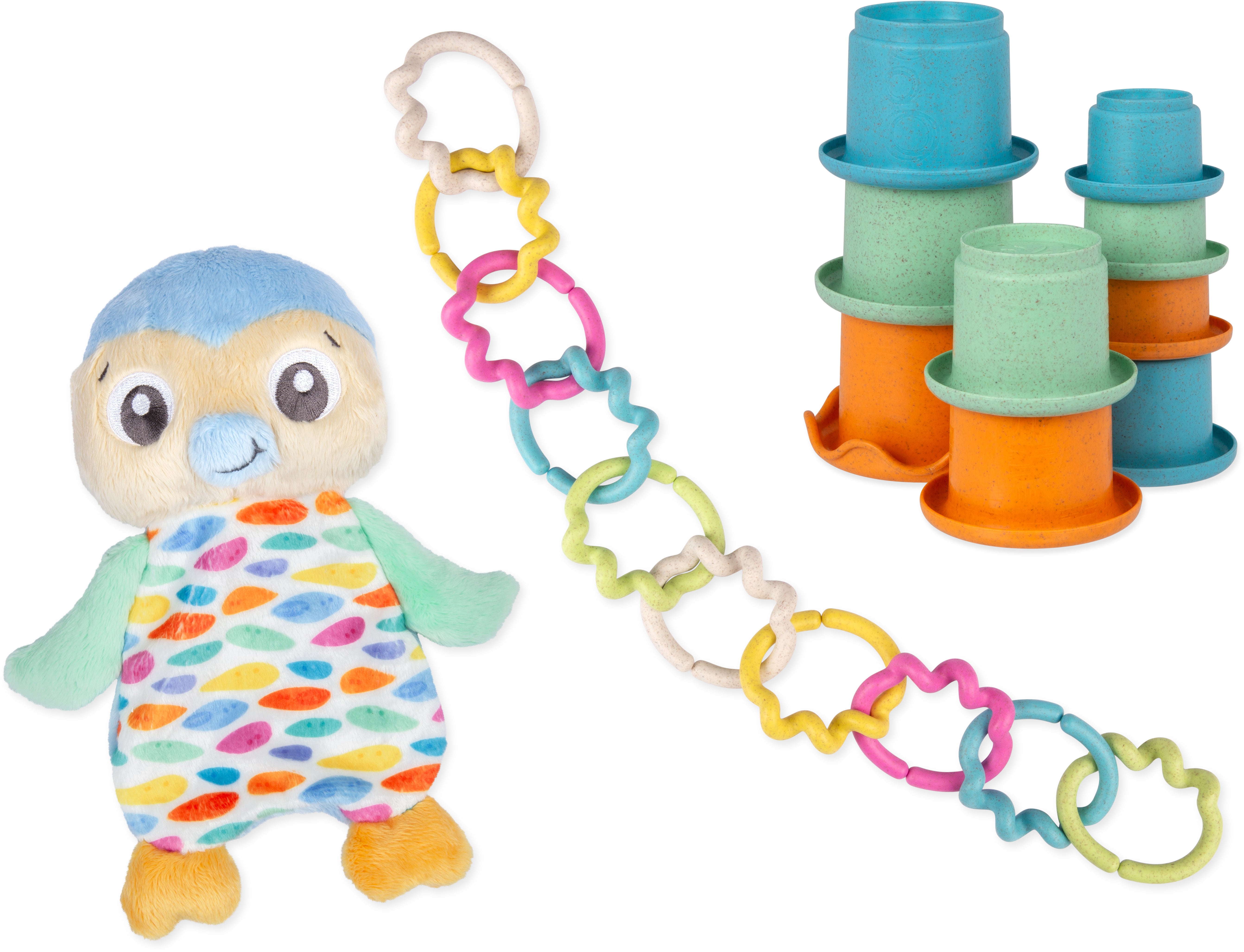Sjovt Eco Play Activity gavesæt fra PlayGro. Perfekt som gave til dåben eller 1-årsfødselsdagen. - Bamsen er lavet af genbrugte PET-flasker. - Ringe og kopper er lavet af 40 % bambus. - Indeholder: 10 forbindelsesringe, 10 stablekopper, 1 bamse. - Anbefalet alder: Fra 3 måneder.