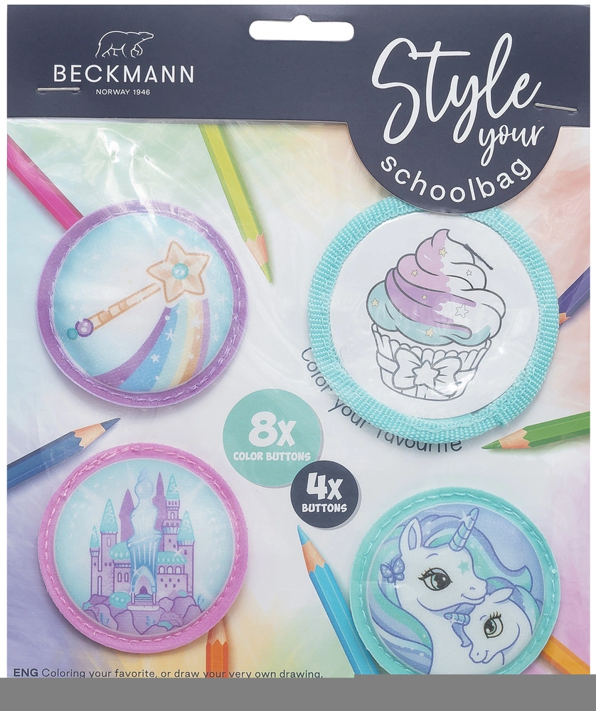 Buttons fra Beckmann. Nu kan du individuelt designe din Beckmann skoletaske med disse fine buttons. De kan udskiftes så tit du vil. En pakke buttons indeholder 4 buttons, hvoraf den ene er udskiftelig, og til denne følger der 8 paletter med, som du selv k