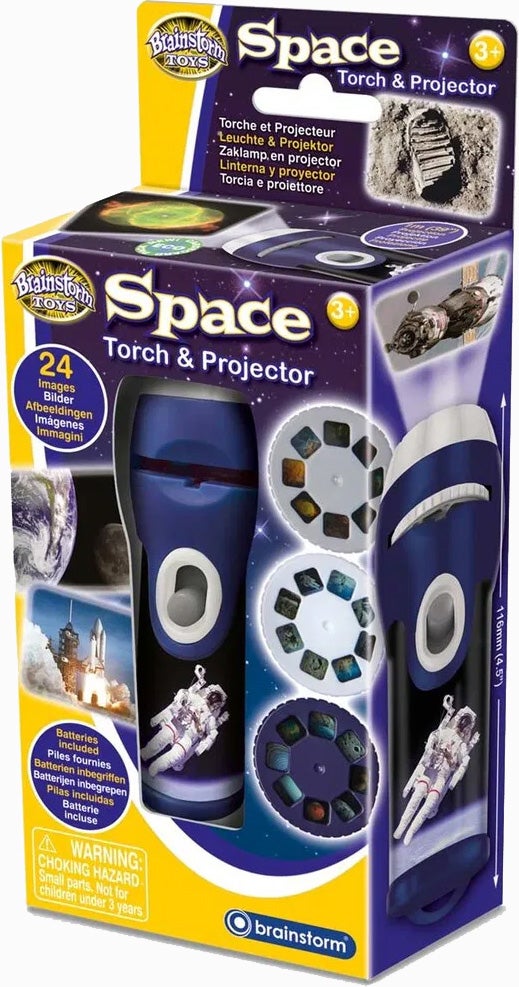 Sej lommelygte & projektor fra Brainstorm med tre projektorplader med 24 farvefotoer fra NASA. Perfekt til at kombinere leg med læring. - Indeholder: 1 lommelygte & projektor, 3 projektorplader med 24 farvefotoer. - Drej på pladen for at skifte mellem billederne. - Justér fokus ved at dreje på objektivet foran. - Farvebillederne kan projiceres til at blive op til 1 m i bredden. - Projektoren kan også bruges som almindelig lommelygte. - CE-mærket. - Anbefalet alder: Fra 3 år. - Plastik. - Batterier medfølger.