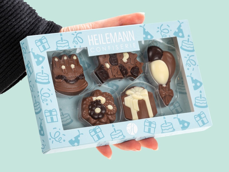 Giv en fødselsdagsfest i æskeformat! Med denne festlige chokoladeæske kan du fejre fødselaren med pomp og pragt uden at skulle puste en eneste ballon op. Chokoladeæsken indeholder fem stykker blød mælkechokolade formet som en fødselsdagskage, balloner, en pakke, en blomsterbuket og teksten Happy birthday.