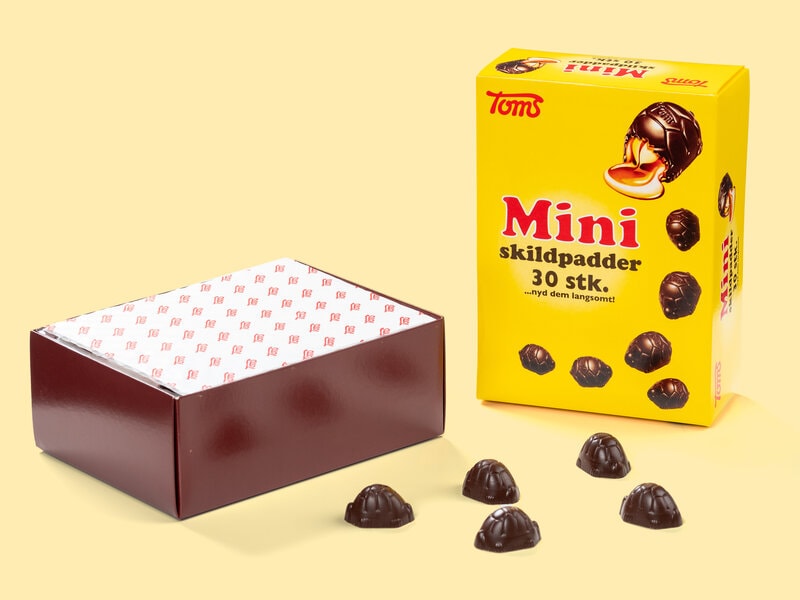 Mørk chokolade med en god romcreme og karamelfyldning - det er Toms Miniskildpadder! I pakken finder du 30 skildpadder.