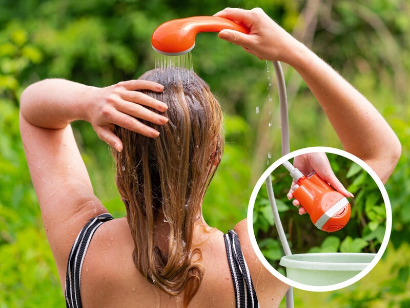 Vores fleksible campingbruser lader dig bade på trods af, at du mangler både badeværelse og rindende vand! Den bærbare bruser har en opladelig pumpe, som du sænker ned i en spand vand eller direkte i bækken. Derefter kan du nyde et rensende brusebad!