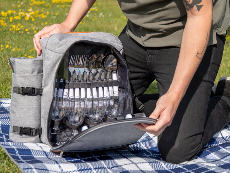 Alt, hvad du behøver til en vellykket picnic samlet i en praktisk rygsæk! Vores picnictaske har et isoleret kølerum og indeholder blandt andet tæppe, tallerkener, glas og bestik til fire personer. Alt kan anvendes flere gange, så du slipper for dårligt engangsservice.