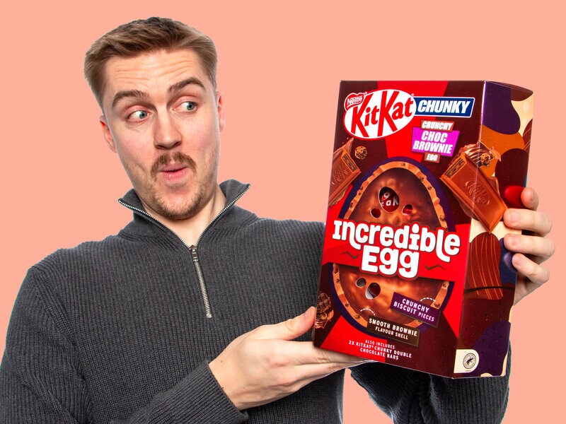 Dette KitKat-påskeæg er en drøm for chokoladeelskere! Indeni den luksuriøse emballage finder du et stort, hult chokoladeæg og to KitKat Double Chocolate bars, fyldt med ekstra chokoladelækkerhed og den klassiske KitKat-sprødhed.