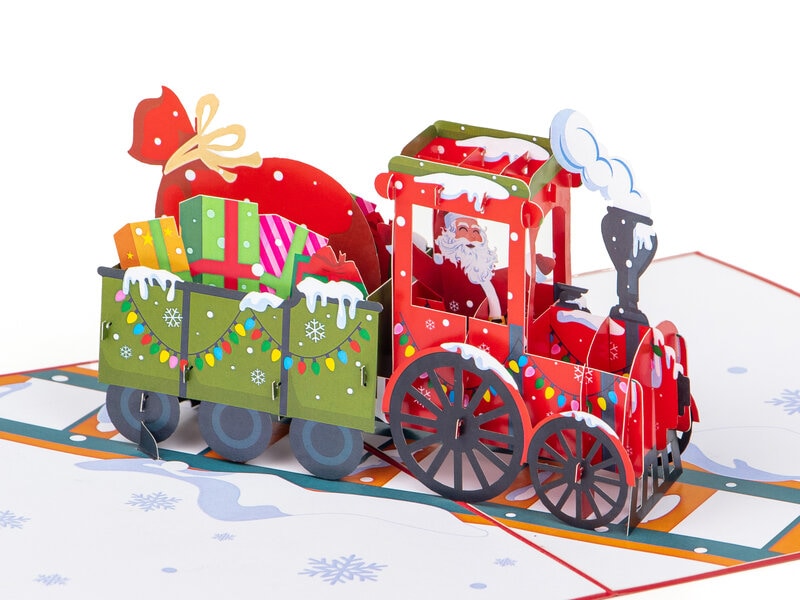 Tøf-tøf! Ønsk en rigtig god jul med et sjovt julekort - når dette farverige 3D-julekort åbnes, kommer julemandens julede tog til syne, og der er både julegaver og julepynt med. Leveres med kuvert.