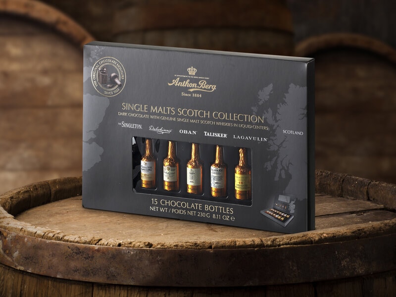 En ægte feinschmecker ved, at rigtig god chokolade er bedst sammen med yndlingswhiskyen. Single Malt Chokoladeæske med Anthon Bergs chokolade af høj kvalitet i fem forskellige whiskysmage, der tager nydelsen til nye højder!