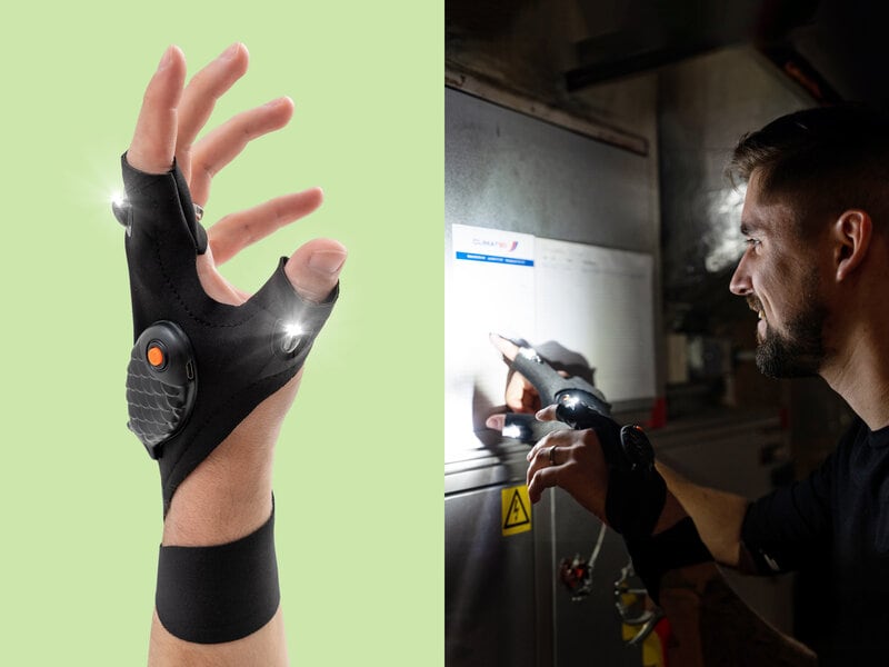 En eller anden fik en genial idé, sandsynligvis da han/hun en mørk nat ville slå det sidste søm i i selvbyggerhjemmet, og hænderne ikke var nok til både hammer, søm og lommelygte. Denne strålende idé mundede ud i et par handsker med indbygget belysning, der giver dig mulighed for at arbejde under bilen eller færdiggøre hjemmeprojektet længe efter mørkets frembrud!