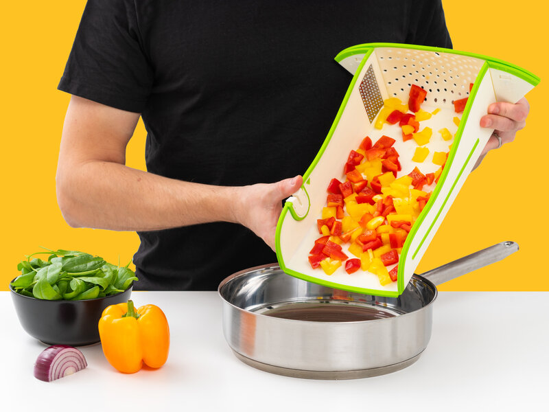 Skærebræt? Jep. Knivsliber? Jajada. Dørslag? Indlysende! Med dette multifunktionelle skærebræt med seks funktioner i én har du alt på ét (skære)bræt.