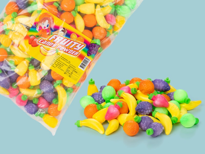 Brusfrugter er en pulverslik med frugtsmag. Denne storpakke indeholder 2 kg små plastemballager formet som frugter, fyldt med virkelig frugtigt lækkert pulvergodteri.