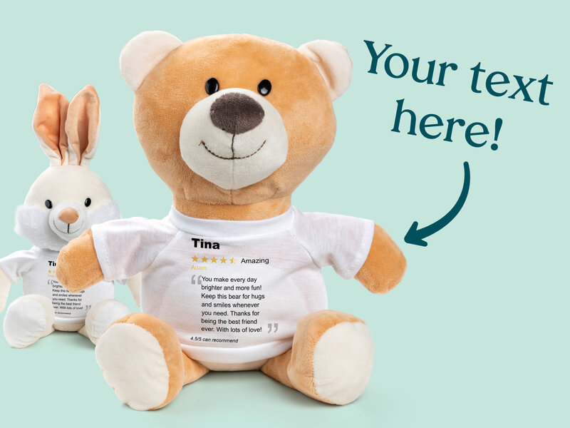 Giv et kram og et smil med vores personlige krammedyr! Vælg mellem en sød kanin eller en krammende bamse, og lad den bære en t-shirt med en personlig og positiv dedømmelse. Perfekt til at vise nogen hvor meget du værdsætter dem!
