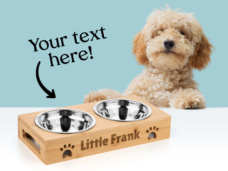 Giv din hund en personlig madoplevelse! Denne madskål er fremstillet i bambus og kommer komplet med to madskåle i rustfrit stål. Indtast en valgfri tekst, måske hundens navn eller et sjovt citat, og vi graverer det for dig på madskålen.