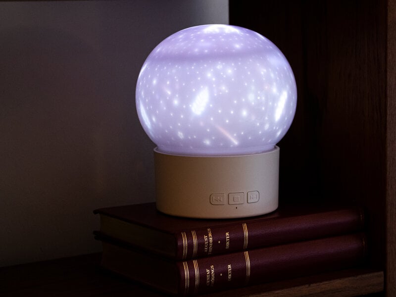 Lys rummet op med en stjernehimmel, med julemotiver eller med smukke fisk, der svømmer forbi i det farveskiftende lys! Den lille natlampe har udskiftelige motivlister og fungerer som en miniprojektor, samtidig med at du kan bruge den som Bluetooth-højttaler og afspille musik fra din mobil.