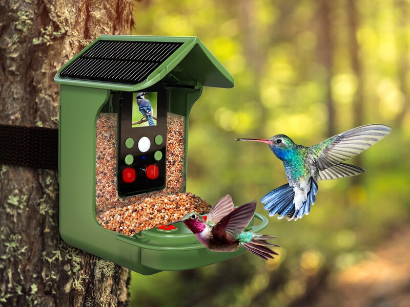 Fodr og film havenes fjerklædte gæster med denne fuglefoderautomat fra Denver! Fuglefoderautomaten er udstyret med solpaneler på taget og kan både tage billeder og filme både om dagen og om natten.