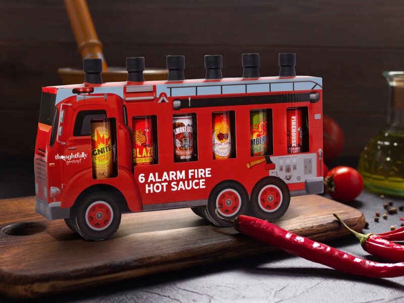 Giv en rigtig hed smagseksplosion med denne gaveæske fra Thoughtfully! Æsken er fyldt med 6 flasker stærke saucer, der vil sætte ild til smagsløgene.