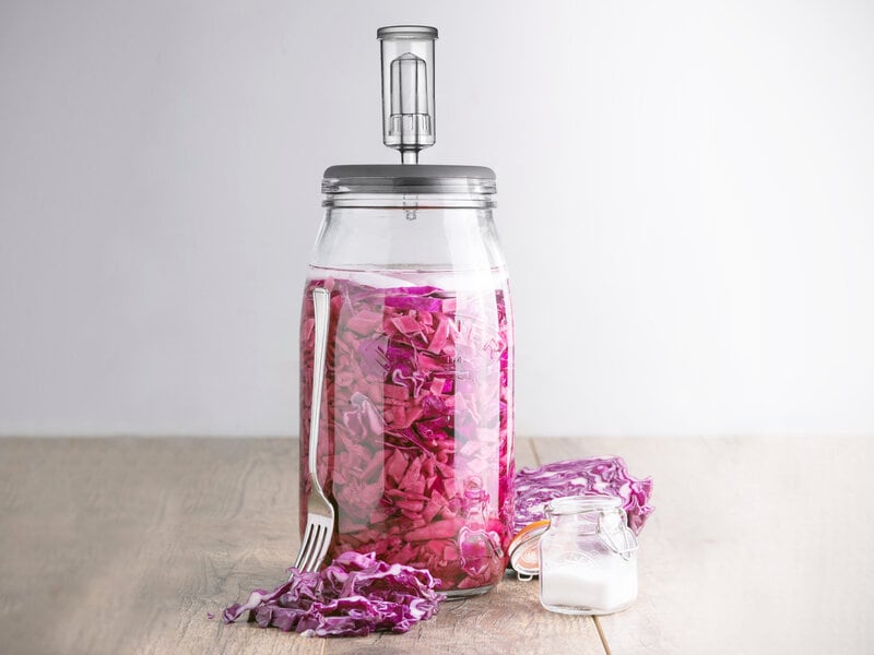 Lav din egen kimchi, surkål og andre lækkerier med Kilner Fermenteringssættet! Det lufttætte glas har en speciel ventil, der skaber et godt fermenteringsmiljø, og keramiske plader, der presser råvarerne sammen. Nyd hjemmelavede fermenterede grøntsager!