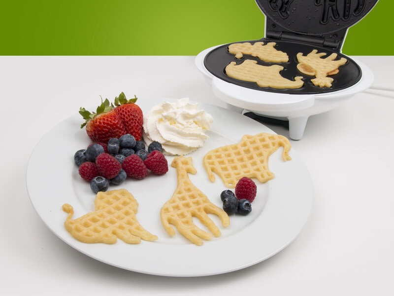 Lav en sød vaffel-zoo! KitchPro Vaffeljern med Dyremotiv bager tre vafler ad gangen i form af en elefant, en giraf og en løve det bliver vildt godt!