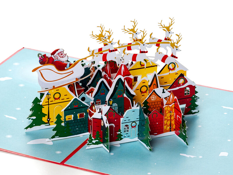 Ønsk en rigtig glædelig jul med et julekort ud over det sædvanlige! Når dette sjove 3D-julekort åbnes, ses et 3D-motiv med selveste julemanden i sin slæde, som kører over en hyggelig juleby. Leveres med kuvert.