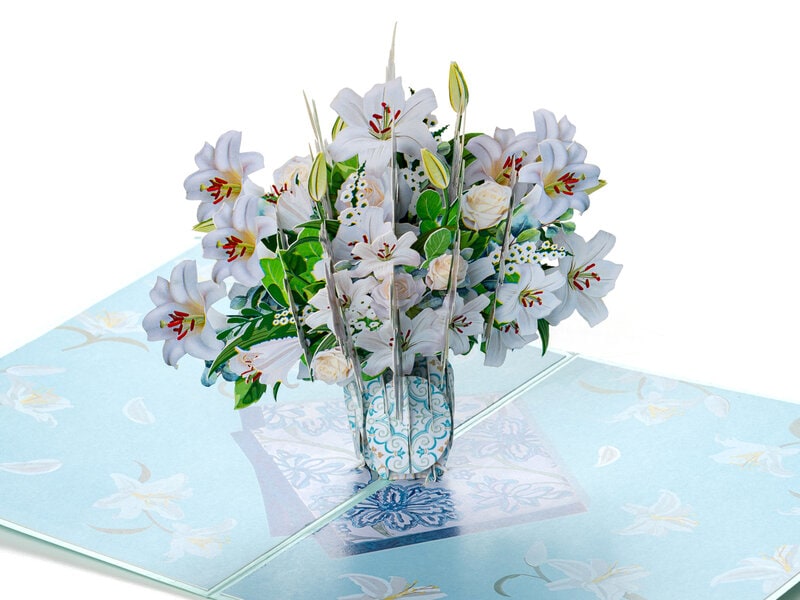 Sig det med en favnfuld smukke liljer! Uanset om du vil sige tillykke, tak eller bare hej, passer pop up-kortet perfekt, og når kortet åbnes, folder en stor buket hvide liljer sig ud. Leveres med kuvert.
