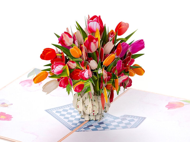 Forkæl tulipanelskeren med en smuk buket! Når modtageren åbner vores farvestrålende pop up-kort, foldes en smuk 3D-buket ud. Leveres med kuvert.