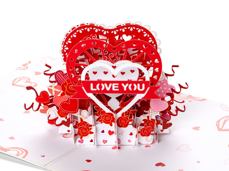Selvfølgelig skal du fejre kærligheden med et romantisk kort, og her dukker teksten LOVE YOU op blandt hjertedekorationer i 3D, når modtageren åbner pop-up kortet! Leveres med kuvert.