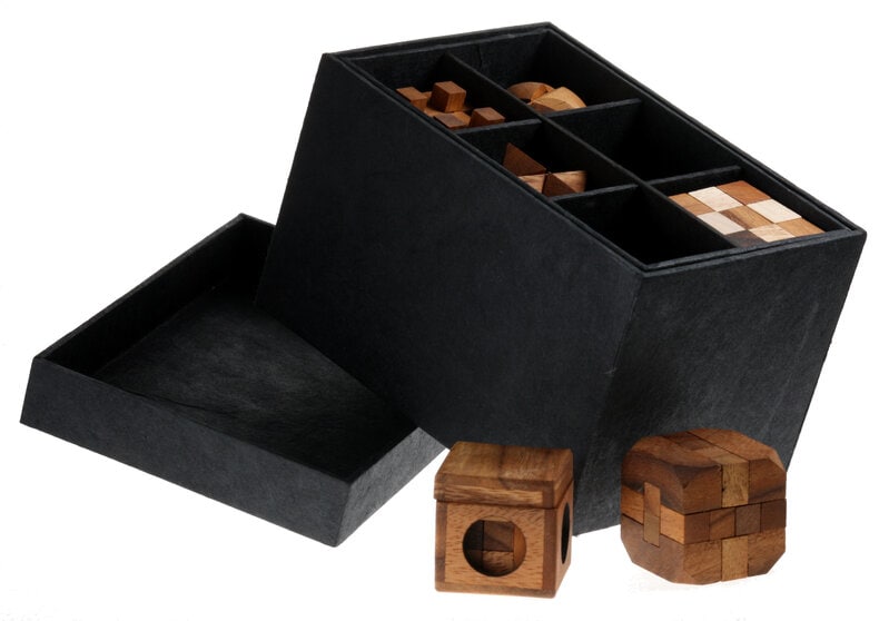 Tolv håndlavede puslespil i en eksklusiv ęske. Med svęrhedsgrader, som varierer fra ""puslespilsgeniet"" til ""den almindeligt begavede"", sųrger de for timevis af underfundig underholdning for puslespilsentusiasten.