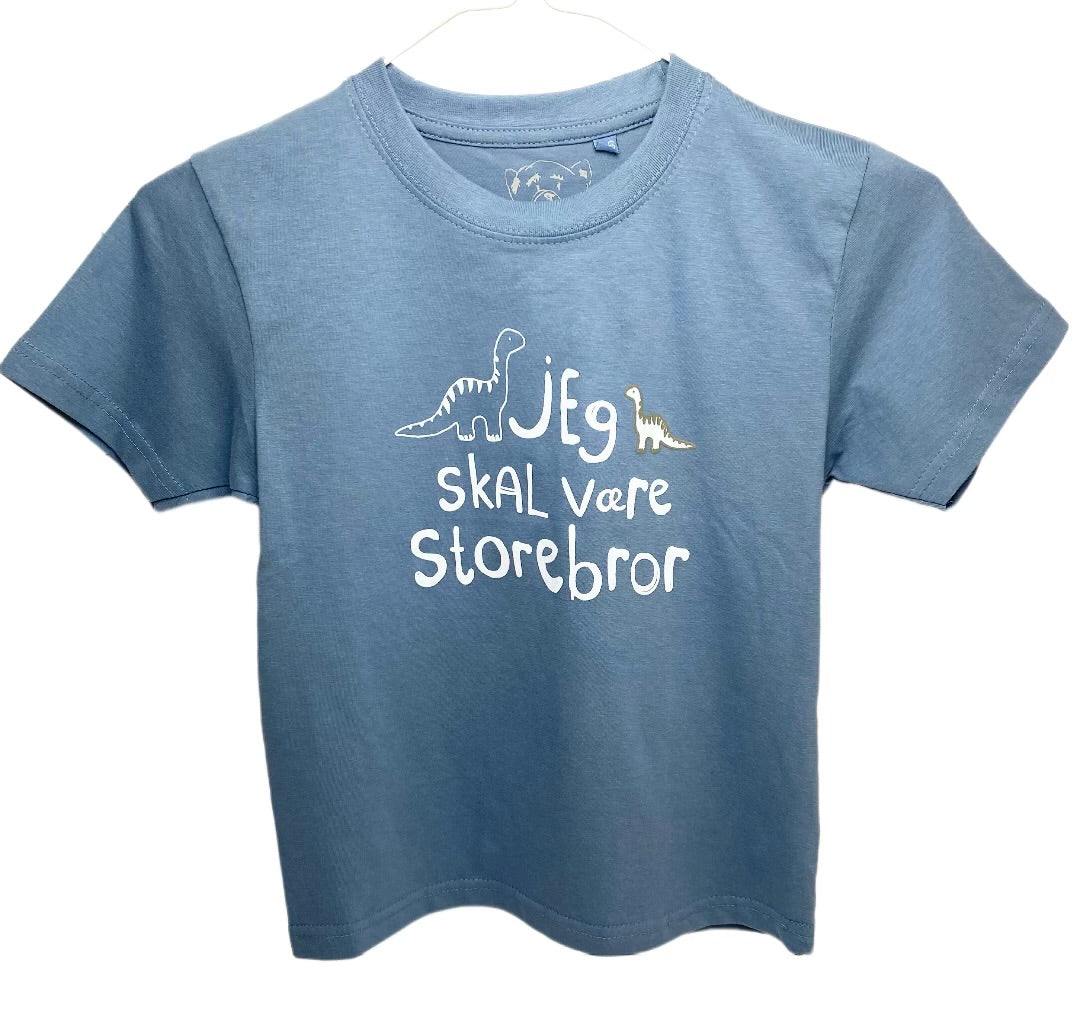 Jeg Skal Være Storebror T-shirt S/S Dinosaur Har du en der skal være storebror? En fantastisk måde at fortælle den gode nyhed på, er med denne flotte "Jeg skal være storebror t-shirt". T-shirten er i en flot denim blå farve og har " Jeg ska