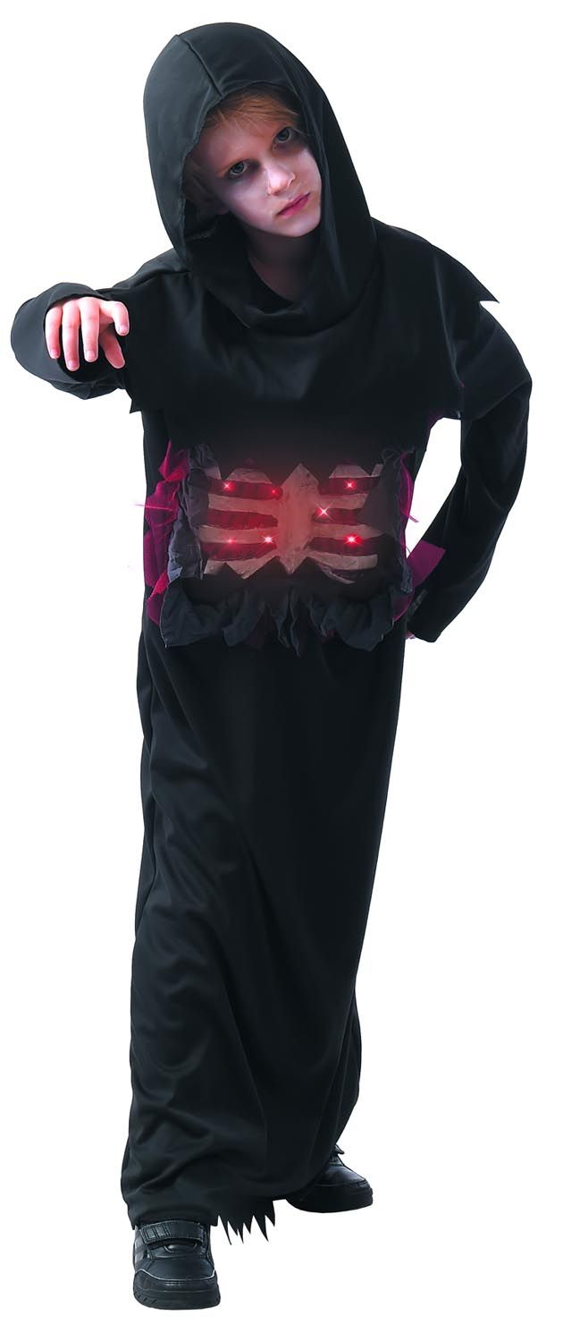 Halloween Skelet Dæmon Med Led Lys 160 Cm. Skeletdæmon med blinkende lys. Dragt med skeletbrystkasse med blinkende lys og hætte. Bruger 3 stk. AAA-batterier.