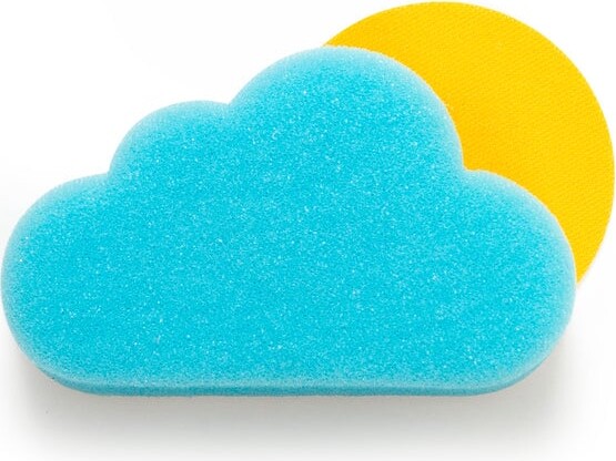 Sæt med skuresvamp og montering til din vask. Skuresvampen er blå og formet som en sky, mens...