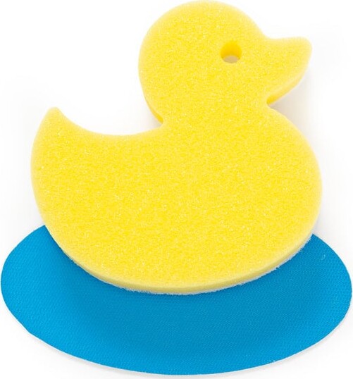 Sæt med skuresvamp og montering til din vask. Skuresvampen er gul og formet som en and, mens...