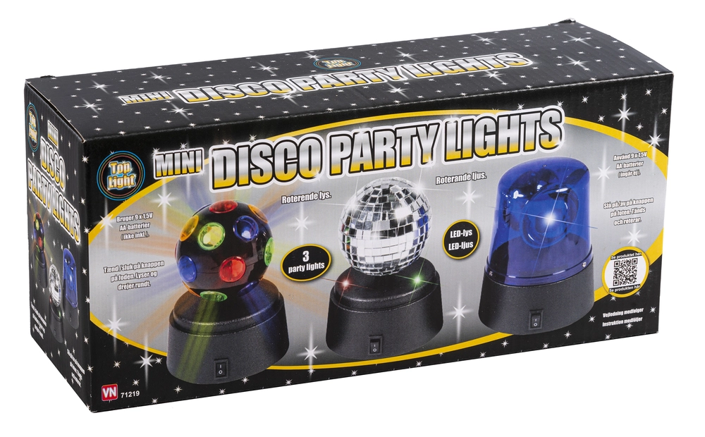3-pak mini diskolys 12 cm høje med roterende LED-lys. Ekskl. 3x3 stk. AA-batterier.