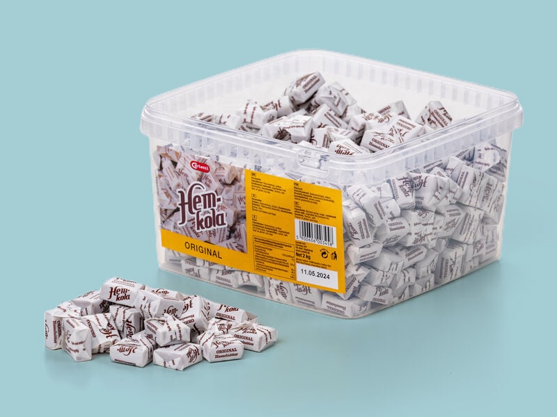Lad op til fredagshyggen med Hemkola Karamel Original, en rigtig klassiker, der værdsættes af alle aldre. Sej karamel med smag af hasselnødder, her i en æske med hele 2 kg af utrolige farver.