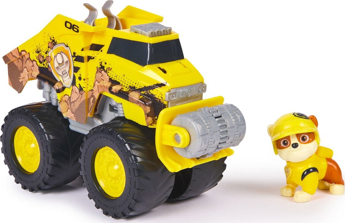 Rubble og hans Rescue Wheels Bulldozer. Rubble's monstertruck har store hjul med autentisk PAW Patrol design og styling, så den ser præcis ud som køretøjet fra serien. Tryk på knappen på...