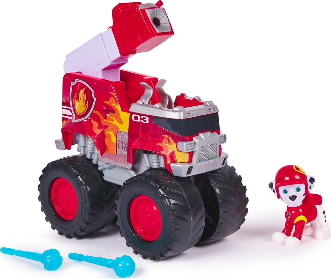 Marshall's monsterbrandbil har overdimensionerede hjul med autentisk PAW Patrol design og styling, så den ligner præcis køretøjet fra showet. Klip Marshall ind i førersædet, inden du racer...