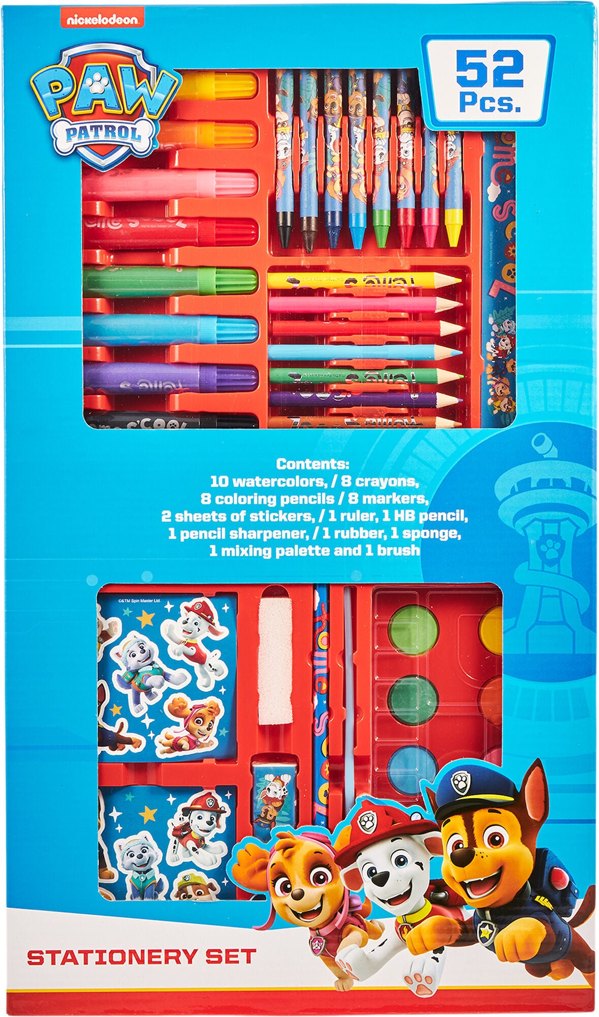 Maleæske med motiv fra Paw Patrol. Kunstsættet indeholder hele 52 dele, blandt andet 10 vandfarver, 8 kridt, 8 farveblyanter, 8 tuscher, 2 ark med klistermærker, en lineal, en blyant, en blyantspidser, et hviskelæder, en svamp, en palet og en pensel. Der er plads til det hele i den praktiske æske med håndtag. Æsken lukkes med trykknap.