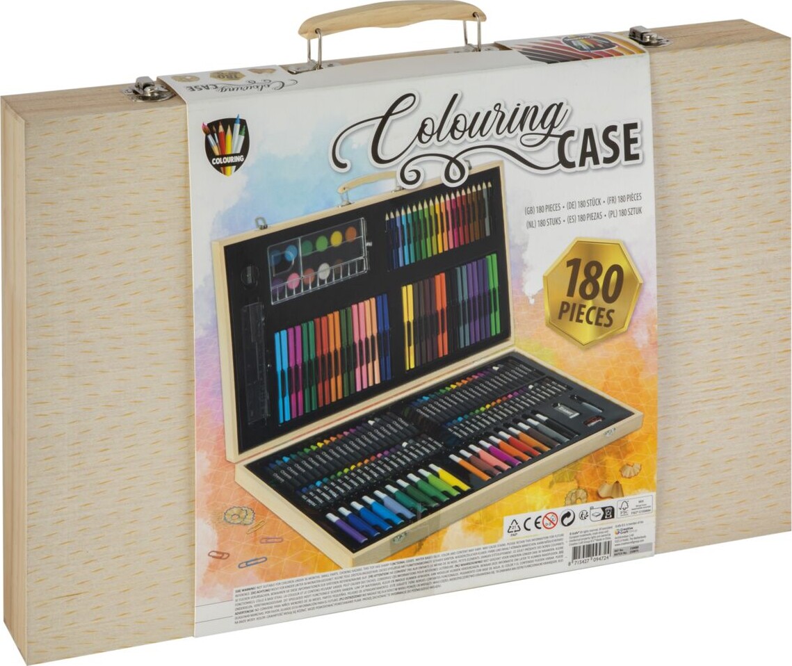• 180 dele, der inkluderer farveblyanter, tuscher, akvarelfarver og meget mere.