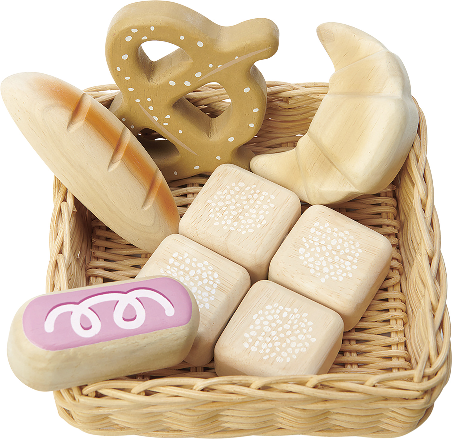 Håndlavet fletkurv med bagerbrød i træIndhold: Flettet kurv, croissant, kage, kringle, flute og et brød, der kan skilles ad i fire stykker.Materiale: TræProdukt: 15,5 x 15,5 x 5,5 cmEmballage: 16 x 5,5 x 16,2 cmAlder: 3-5 år