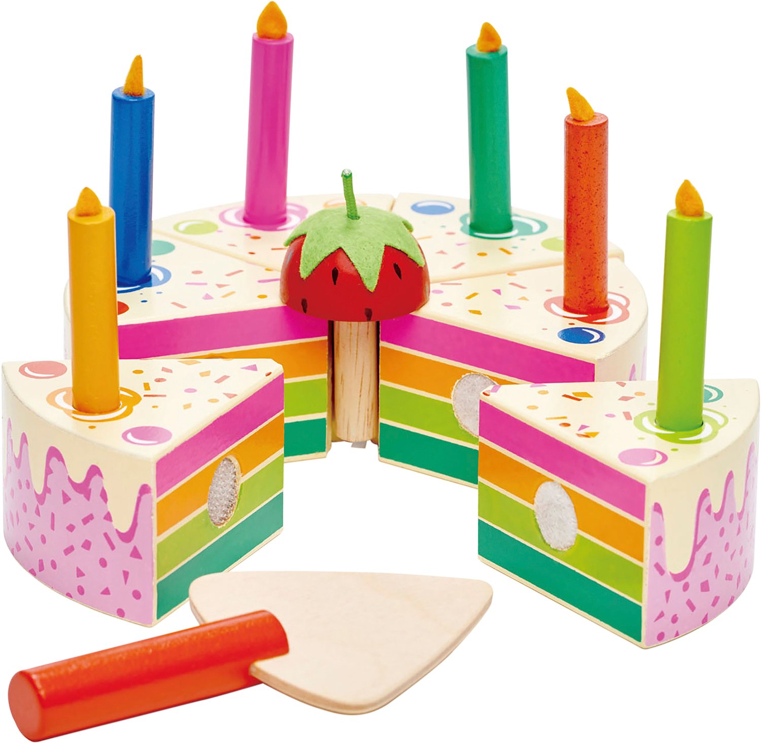 Dekorativ og farverig lagkage i massivt træ, toppet med 6 lys i forskellige farver og et jordbær i midten.Skær og server ved at bruge den medfølgende kagespade og se det flotte snit med de farvede lag indeni.Lagkagen er delt i 6 skiver, som holdes sammen