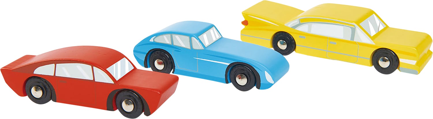 3 klassiske sportsvogne i massivt træ.1 rød, 1 blå og 1 gul bil.Materiale: TræEmballage: 18,5 x 4,1 x 18,1 cmAlder: 3-6 år