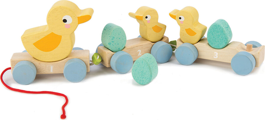 Meget sødt træklegetøj med 3 vogne med hjul, 1 voksenand, 2 ællinger og 3 æg. Vognene kan...