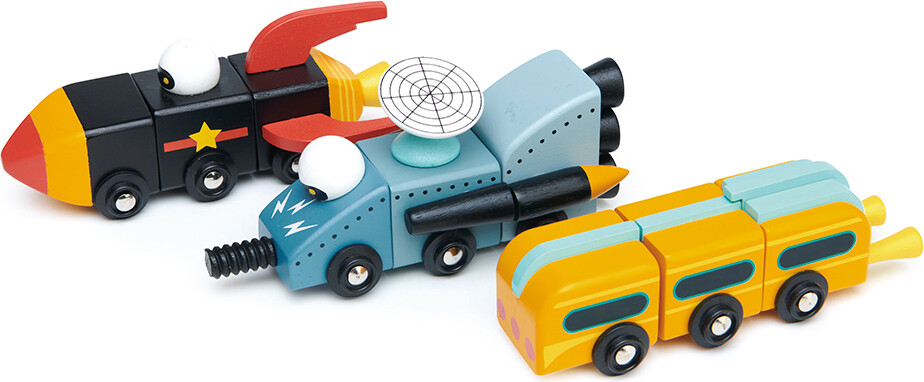 Disse futuristiske rumkøretøjer er bygget af 9 forskellige trædele med hjul, så de kan skilles...