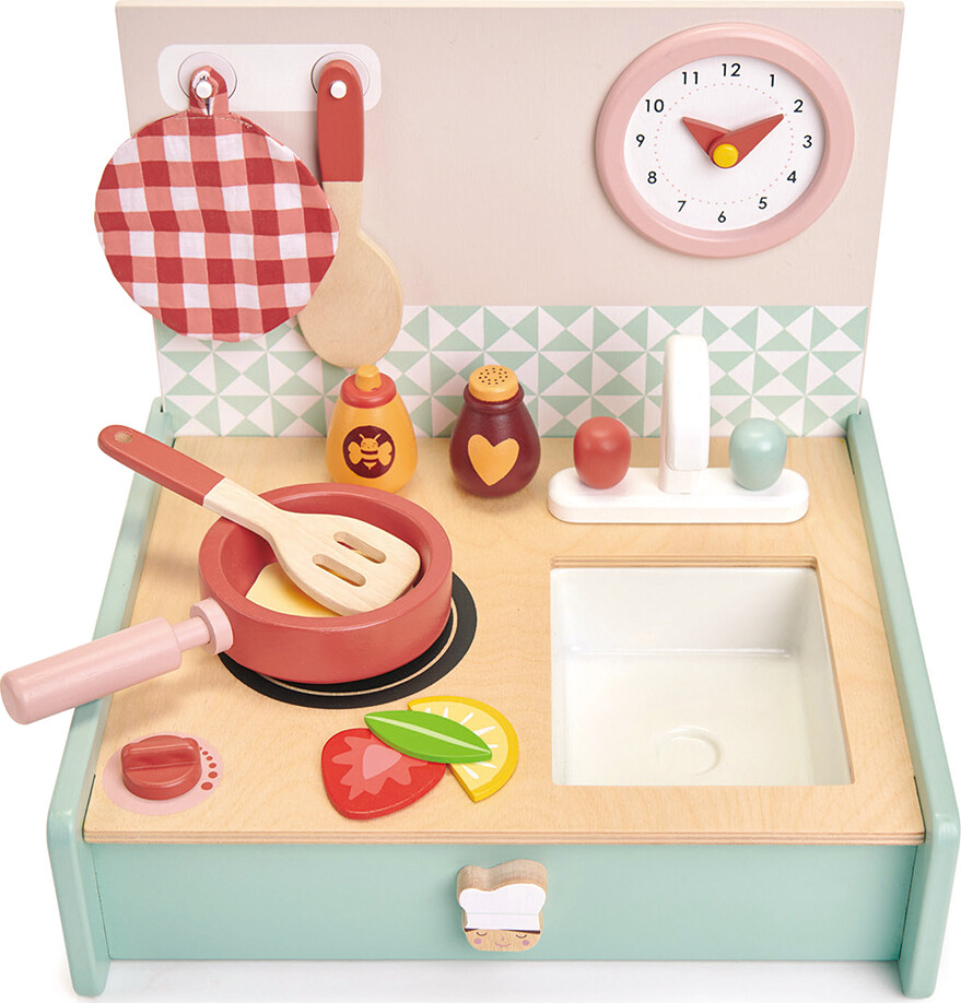 Et transportabelt lege-tekøkken, der let kan pakkes sammen og tages med. Køkkenet har en...