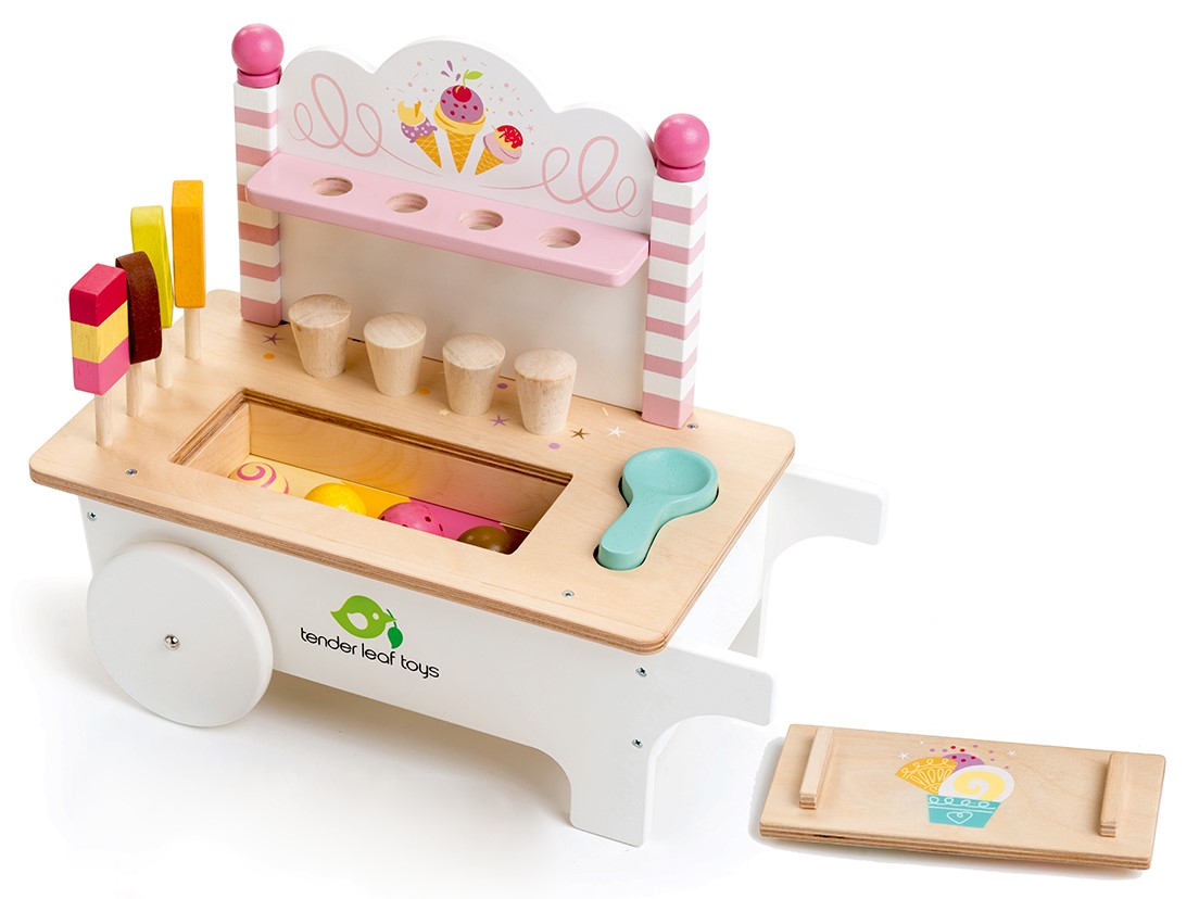 Uhm så er det tid til lækre is. Kom og køb. Hvad skulle det være?En chokoladeis og en vaffel med ananas-isOkay. Ja så gerne.Med denne fine isvogn kan dit barn lege issælger og lange både ispinde og vaffelis over disken.Vognen er oplagt til leg med flere børn, hvor ungerne kan øve sig i at skiftes til at være sælger og issulten kunde.I kan også træne talforståelse, når dit barn skal finde på nogle skarpe priser på sine is.Fremstillet bæredygtigt af træ fra træer, der er blevet til overs i latexindustrien. Isvognen kommer med:4 legemad is i træ4 lækre vafler4 kugler til vaflerne - sidder fast til vaflerne med magneter2 bægre til de kunder, der ikke så godt kan lide vaflerIs-ske (har også magnet i). Det lækre design har vundet flere internationale priser: Tillywig Award Winner 2018 Junior Design Awards 2018, Silver Medal for Best Toy Design 3-5 Years.