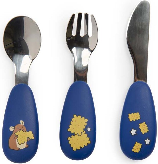 Bestiksæt med illustrationer fra serien Puce & Pilou, bestående af gaffel, ske og kniv....