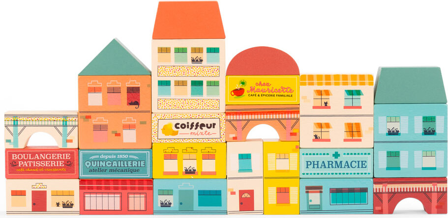 Med dette sæt, er det det muligt at bygge sin egen by ved hjælp af 34 illustrerede træklodser....