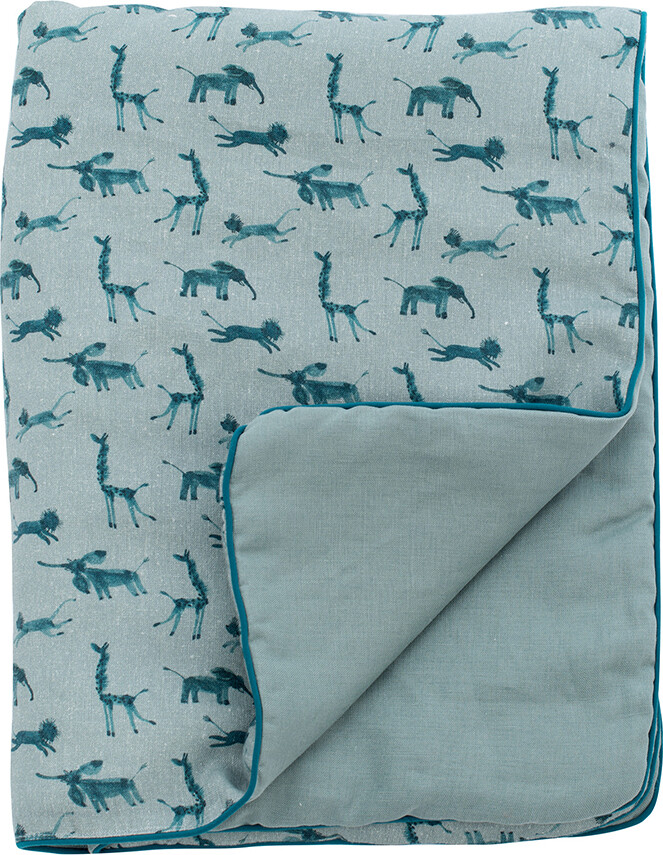 Blødt babytæppe i støvet blå med fint dyreprint på den ene side og ensfarvet på den anden...