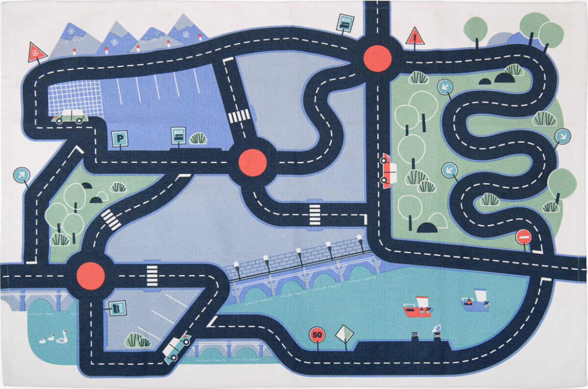 Legetęppe til biler med vejbaner, parkeringsbåse, park og endda en havn til både. Bųrn vil elske...