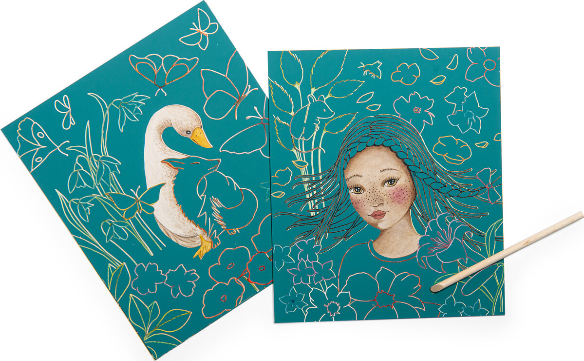 Skrab forsigtigt på kortet med den medfølgende pind af bøgetræ for at afsløre billeder af...