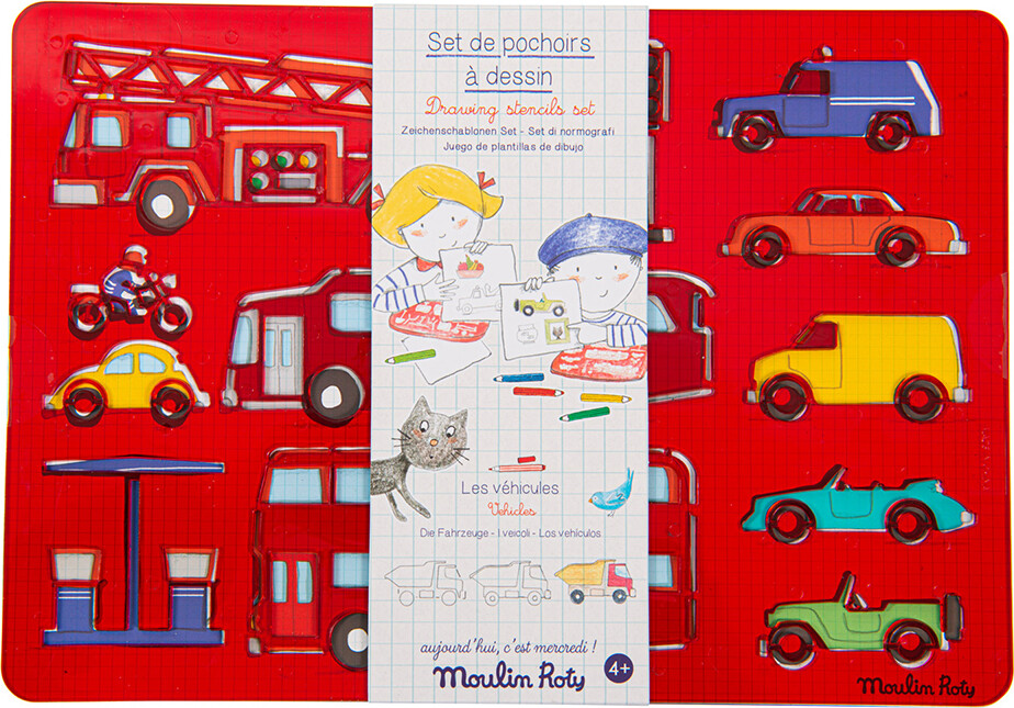 Sæt med to stencils, så man let kan tegne alle slags køretøjer: Motorcykler, biler, busser og...